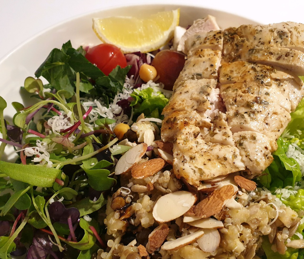 담백한 닭고기 가슴살에 싱싱한 채소, 은근한 단맛이 도는 다양한 곡물이 곁들여져 있다. 주메뉴가 곡물이라 이름도 그레인 볼 (grain bowl)