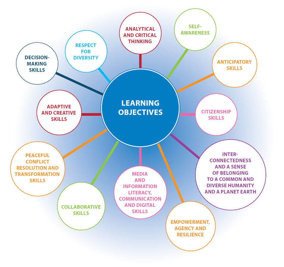 비판적인 사고와 분석력, 다양성에 대한 존중, 의사결정 능력, 적응력과 창의력, 평화적인 분쟁 해결력, 협력에 필요한 기술, 미디어 문해력, 주체적인 행동력과 회복 탄력성, 인류와 지구 공동체에 대한 소속감, 시민성, 미래예측 역량과 자기 성찰