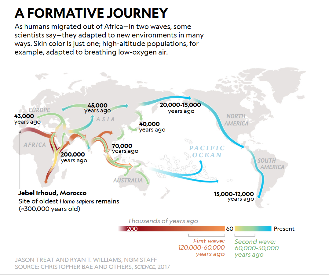 인류가 새로운 환경에 적응해 가면서 피부색 또한 옅어지기도, 다시 짙어지기도 했다고 설명한다.